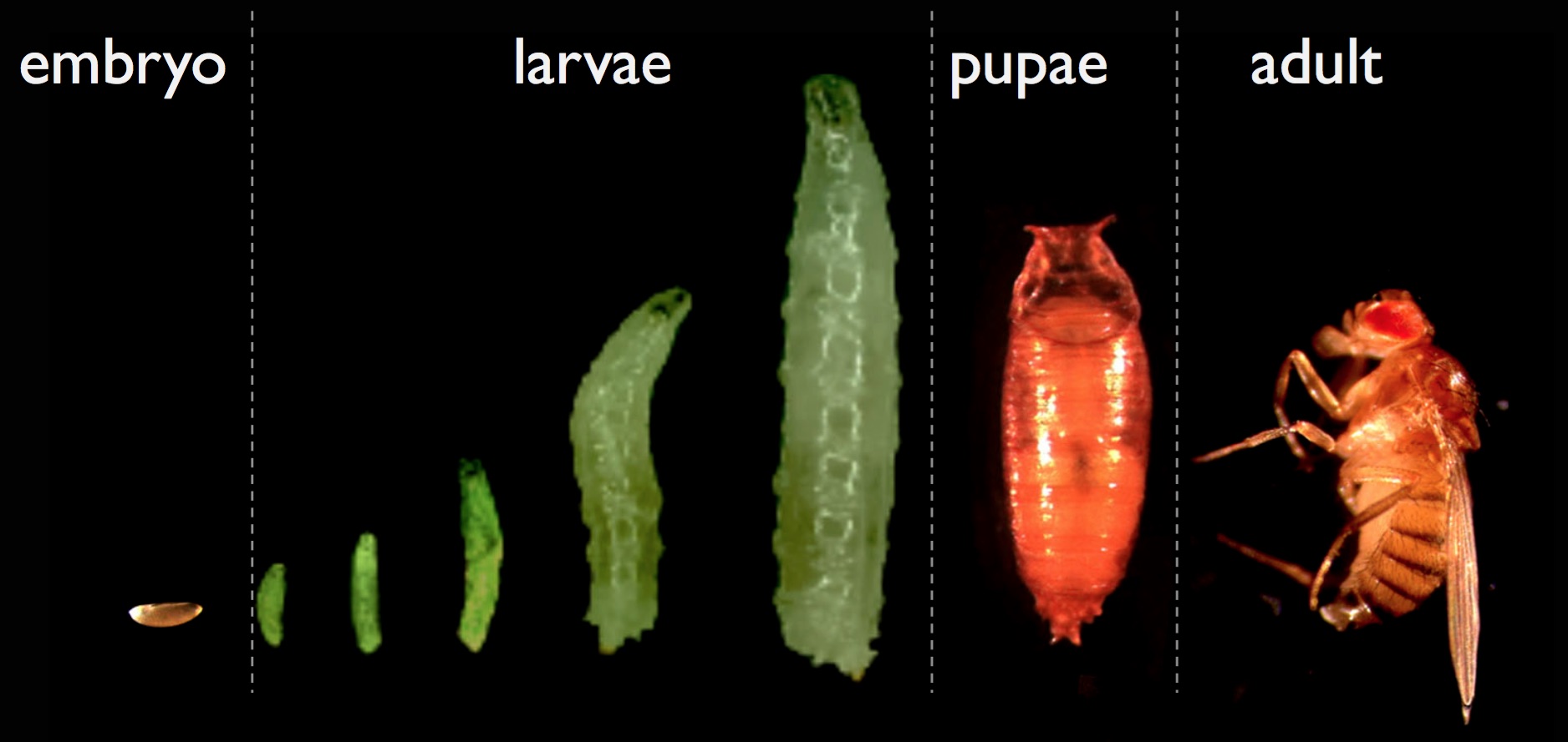 During the four-day Drosophila larval period, animals increase in mass almost 200-fold. This dramatic growth mostly occurs in non-dividing polyploid cells that make up the bulk of the larval organs. Since neither pupae nor adults grow, final body size is determined by growth during the larval period. The versatility of the Drosophila genetic tool-kit allow us to ‘turn-on’ or ‘turn-off’ genes at any time or any place (cells, tissues, whole body) during development, making Drosophila larvae an excellent model system with which to study the control of growth.