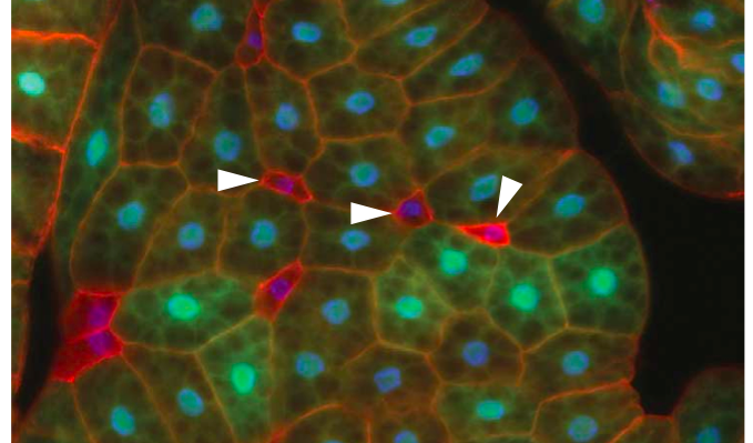Brf mutant fat body cells (arrowheads) show decreased size compared to surrounding wild-type cells (GFP-labelled) – see Marshall et al, 2012